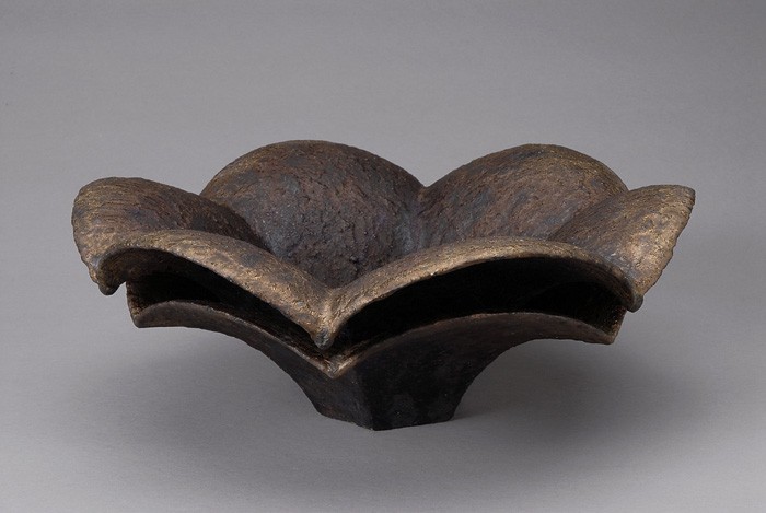 写真の鈴木卓の作品は、そこいらの坊さんのらちもない話を聞かされるよりは、その静かな姿によほど純一な宗教的啓示のようなものを感じさせる。独自の古びたマチエールをまとって「ひらくかたち」と言うらしい。天平か藤原の、鍍金のはげて黒ずんでいる蓮弁か仏手のような趣である。手びねり、ひもづくりで成形する。線が美しい。深い沈黙を湛えたような作品である。高度に芸術的な作品には、作者の祈りのようなものが現れるのではないか。そして見る者に宗教的カタルシスを感じさせる。変な見方で、彼はそんなことを意識していないだろうが、しかしこれも見物の勝手で、抹香臭かったことはご寛恕願いたく云爾(シカイウ)。