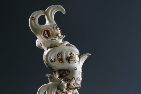 写真の作は植葉香澄のものである。台座からぐいぐいと螺旋状にひねり上げている。遺伝子のそれのように見えてくる。てっぺんでキメラが今にも姿を現さんとしている。なにかタイトルはあるかと問えば、彼女はこれをChimera Evolutionとしたいと言う。エボリューションには生物の進化という意味が含まれる。なんだか言い得て妙である。花を透かした台座は、仏像の框(かまち)座のような印象である。そこから手びねりで50cmほど引き上げている。天晴な造形だと思う。台座の底は残念ながら窯キズが入ってしまったが、現在漆の本職に金繕いをしてもらっている。思い切ったこれだけの造形にありがちな向うキズのようなものだと思っている。筆者は、これにエラン・ヴィタール、生命の躍動といったものを見る思いがする。生命の沸騰というか躍動といったものが、創造的進化をもたらすのではなかろうか…。この作は、はからずも進化の様相の秘密のようなものを垣間見せて成功しているし、まこと彼女の真骨頂が如実なのである。-葎-