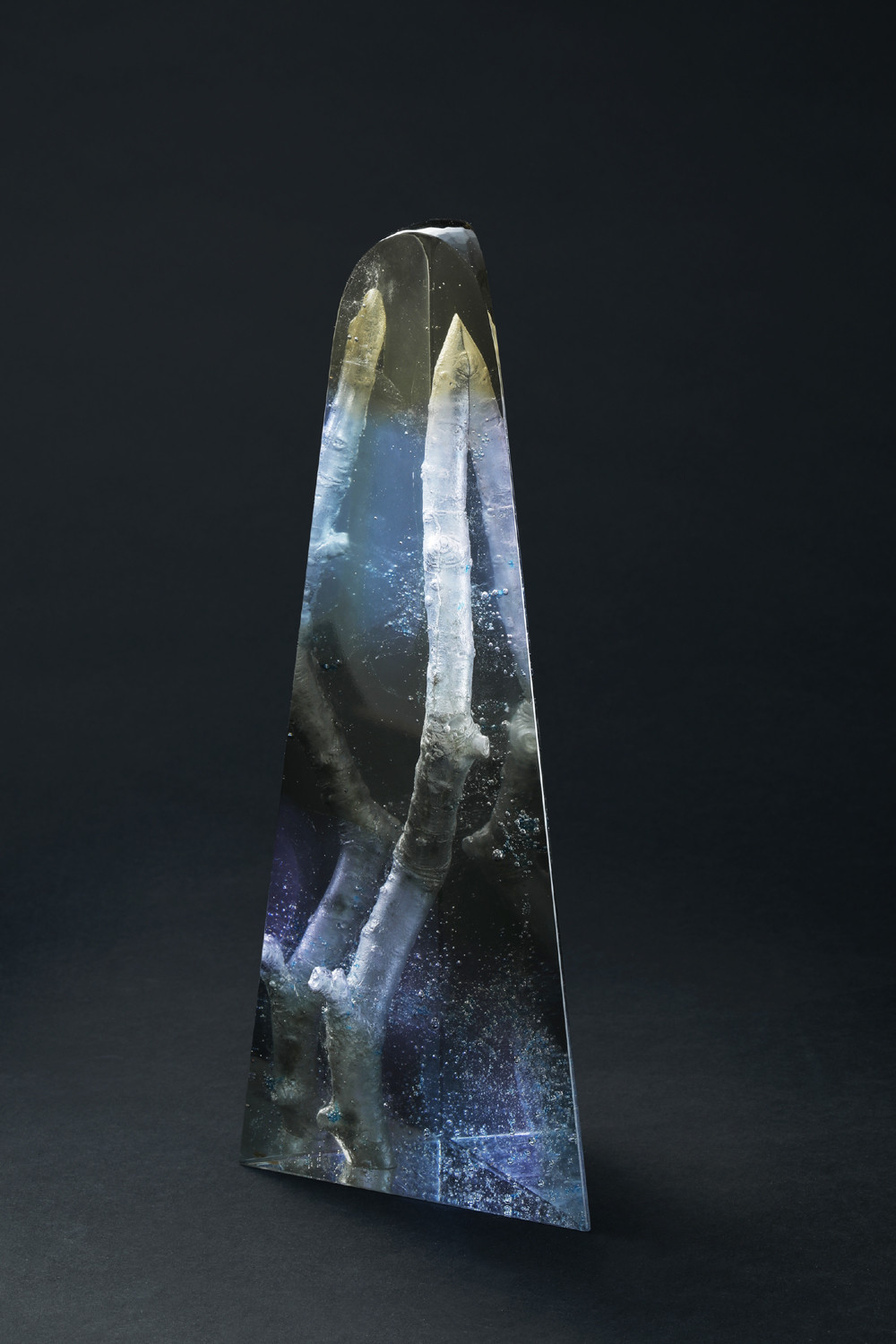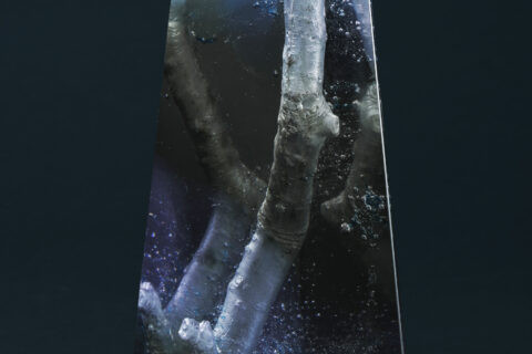 写真の硝子に閉じ込められた木の枝は桜です。元になるものは、一部は実際の枝から型取りするそうですが、その他の躯体は奥島さん自身が石膏を彫塑して作っています。それを外型のなかに入れ、粉砕硝子で葬るように埋めます。そして熔解炉に入れます。冷却後に、外に連絡する湯口のような穴から石膏をこぜり、ほじくり出します。耐火石膏ですが、水を染ませれば軟化するものがあるとの由。そのあとの工程、硝子の研磨、磨きにはとくに丹精が要ると聞きます。桜の木というものは、昔から私たちにとって格別の樹と思われてきました。この桜の枝、ディテールに凄みを感じさせます。瑪瑙に閉じ込められた何億年も前の化石がありますが、それのアーティフィシャル版ともいうべきでしょうか。永遠の相の垣間見せともいうべき作品と思われます。