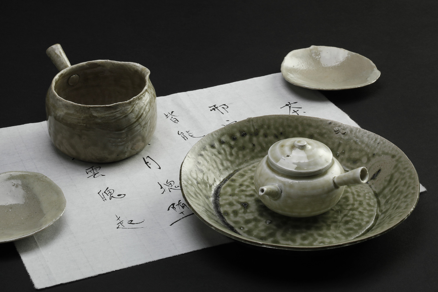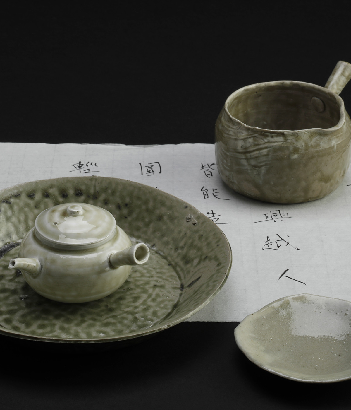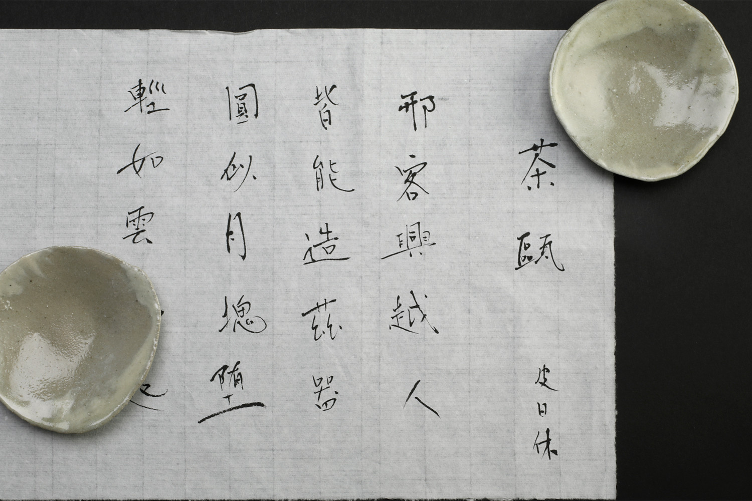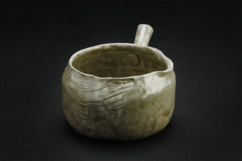 しかし、本展について、梶原は晩唐の詩人、皮日休(ひじつきゅう834−884?)の「茶中雑詠」より「茶甌(ちゃおう)」という詩を選び、「漢詩の中の器を作ってみました」と言う。皮日休にとって、邢州窯と越窯は同等であった。邢客與越人/皆能造茲器/圓似月塊堕/軽如雲魄起… 邢窯と越窯/どちらも能くこの器を造る/円きは月塊の堕つるに似/軽さは雲魄の起こるが如し。越窯の「秘色」青磁については、皮日休とも接点があった、唐代の陸亀蒙(りくきもう?-881)『秘色越器』の詩句「九秋風露越窯開、奪得千峰翠色来」のほうが知られているだろう。晩秋の風が冷たい折に越窯が開かれる、千峰の翠色を奪い得て来たようだ、と。越窯秘色を歌った詩には事欠かない。