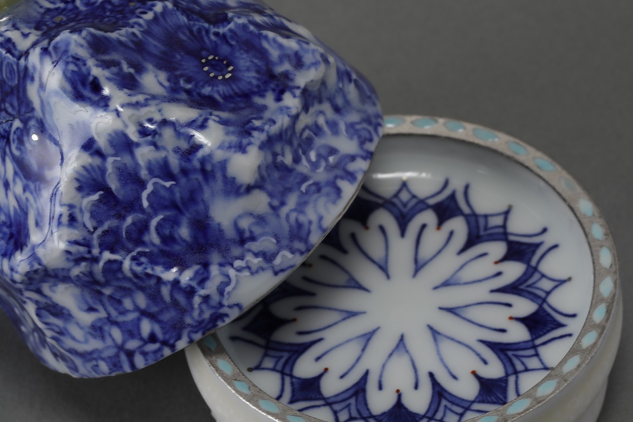 色絵白金彩蓋器 “藍山百容”